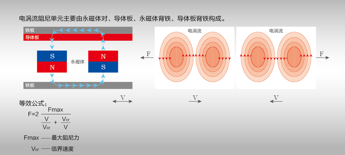 基本原理:當導體板(銅板或鋁板)在兩塊永磁體之間的空氣間隙中沿垂直磁感應強度方向運動時,導體板中產(chǎn)生電渦流。渦流場與磁場相互作用,產(chǎn)生的洛倫茲力將阻礙導體板和磁場之間的相對運動(楞次定理),同時電渦流因?qū)w板中的電阻作用而轉(zhuǎn)化為熱能耗散掉,產(chǎn)生阻尼效應。當導體板或永磁體與振動結(jié)構(gòu)連接時,導體板上不斷地有電渦流產(chǎn)生,同時結(jié)構(gòu)的動能不斷地轉(zhuǎn)化為導體板中的熱能,使結(jié)構(gòu)振動逐漸衰減。